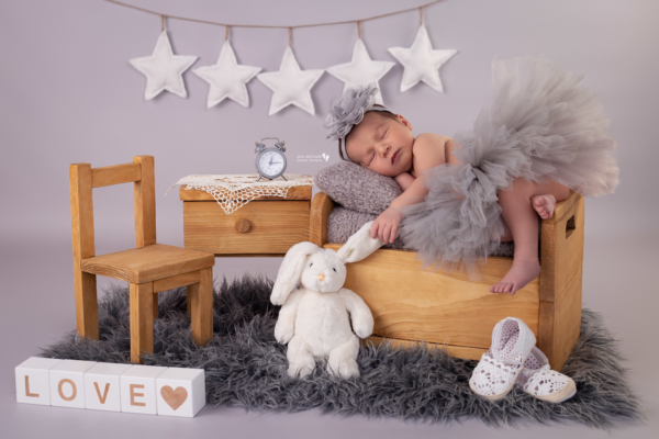 Kolorem przewodnim tej sesji była szarość. W tym ujęciu ociepliłam scenerię jasnym drewnem. Ja chciałam owieczkę, natomiast mama małej modelki króliczka… Za to obie zgodnie chciałyśmy tiul :] Mini pokoik wyszedł przytulnie i dziewczęco (pomimo braku różów 😉 ).