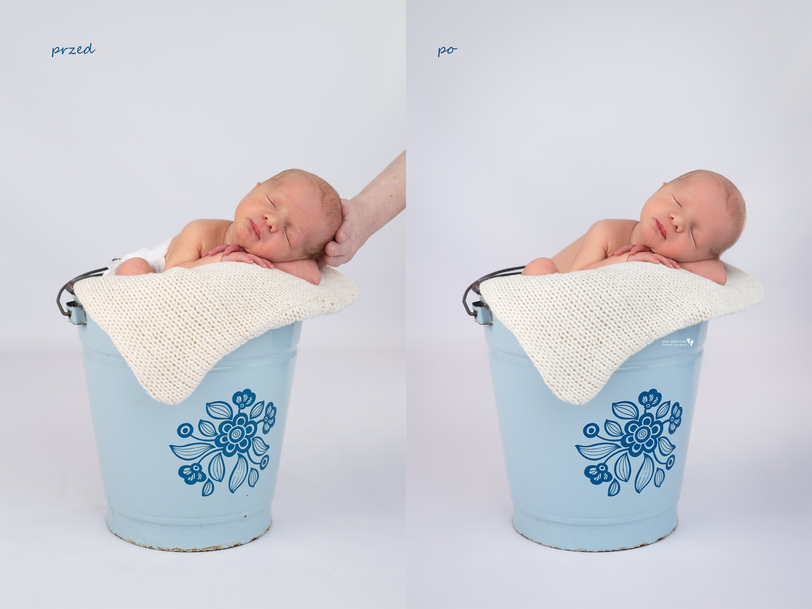 Na wstępie informuję, iż przeszłam specjalistyczne szkolenie z zakresu bezpiecznego owijania i układania noworodków do zdjęć. Niektóre pozycje czy rekwizyty mogą Państwa niepokoić, gdyż wydaje się, że dziecko jest w nich ułożone w sposób niekomfortowy. Uspokajam, że to tylko fotograficzne triki i odpowiednie „know how”. W każdym rekwizycie znajduje się kilka odpowiednio ułożonych lub zrolowanych kocyków, które stanowią podpórki i odciążają ciało dziecka. W niektórych ujęciach dziecko jest dodatkowo asekurowane przez rodzica, a podtrzymującą je rękę usuwam później w programie graficznym. Zapewniam, że każdą pozycję konsultowałam ze specjalistką. W razie jakichkolwiek wątpliwości służę szczegółowymi informacjami.